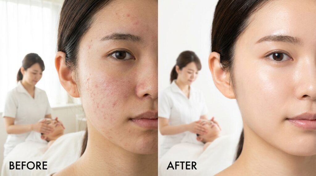 これらの施術を月2〜3回のペースで継続することで、約3ヶ月でニキビの新規発生が大幅に減少し、既存のニキビ跡も徐々に改善されていきます。